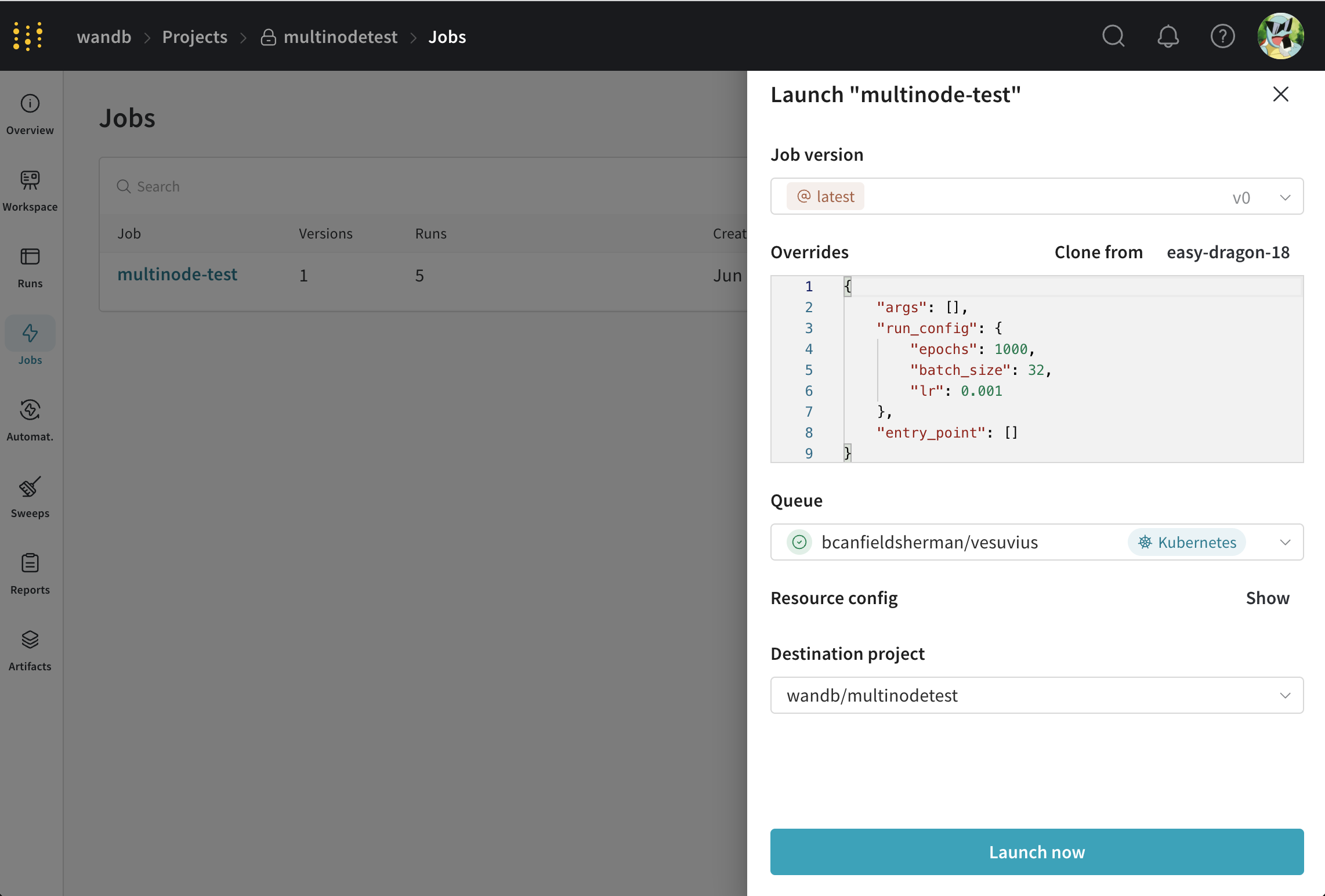 キューを作成したので、キューからジョブを取得して実行するための Launch エージェントをデプロイする必要があります。最も簡単な方法は、W&B 公式のhelm-charts リポジトリにある launch-agent チャート を使用することです。README の指示に従って Kubernetes クラスターにチャートをインストールし、エージェントが先ほど作成したキューをポーリングするように設定してください。